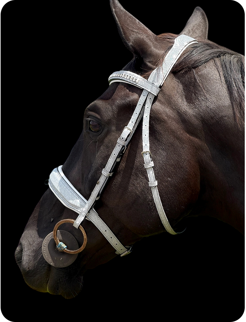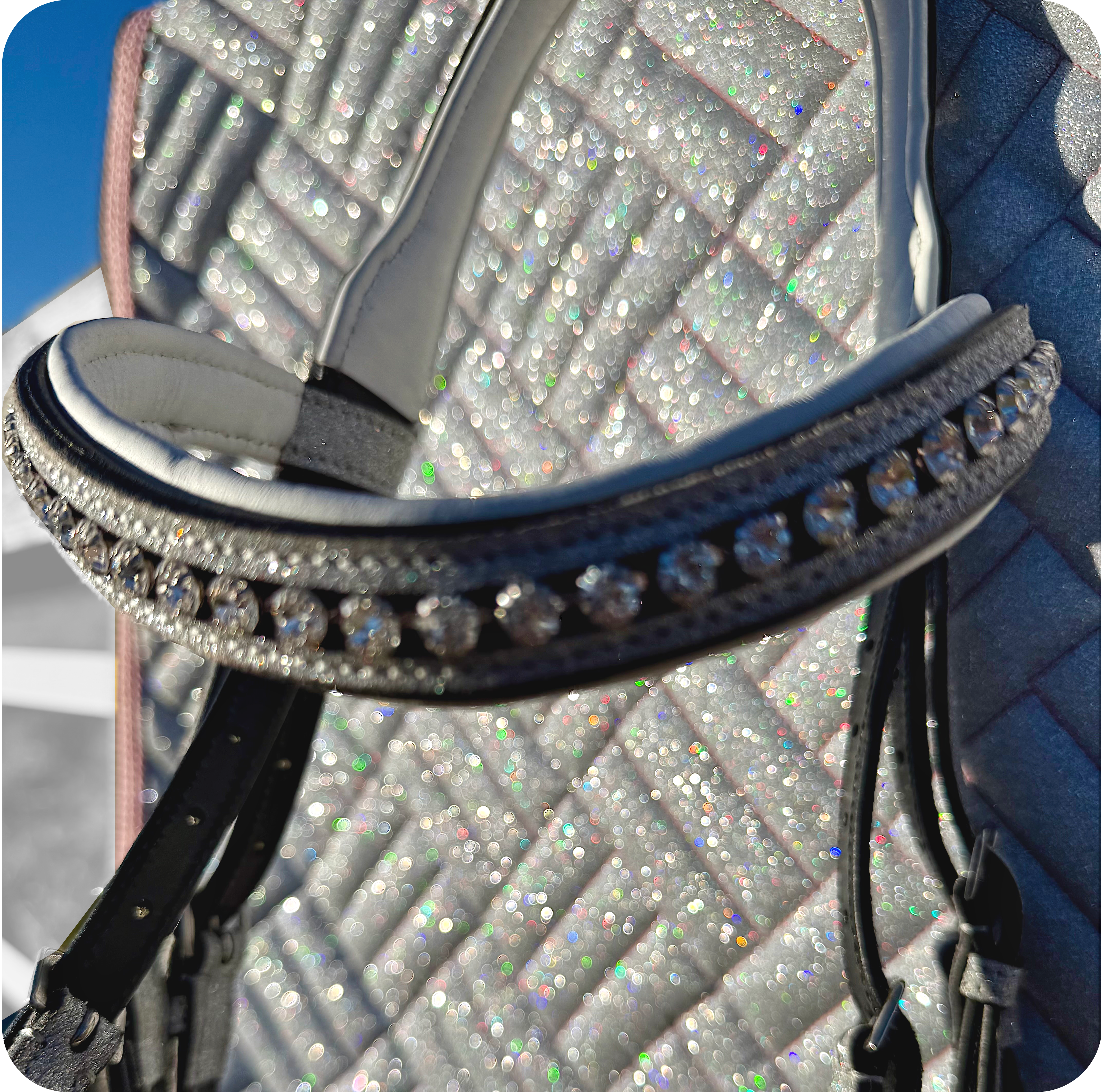 Die Trense ist mit einem englisch kombinierten Reithalfter (Nasenriemen + Sperrriemen) ausgestattet und funkelt allover wunderschön in Silber. Mehr Blingbling geht nicht.
